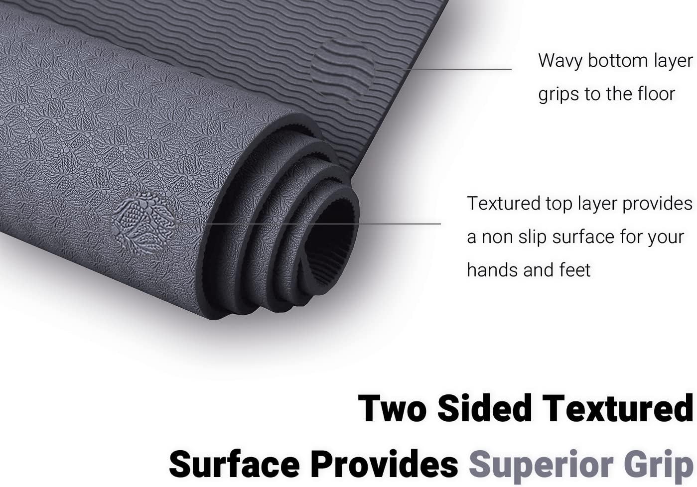 تشک یوگای این ست با ضخامت استاندارد 6 میلیمتر و طراحی دوطرفه ضدلغزش،