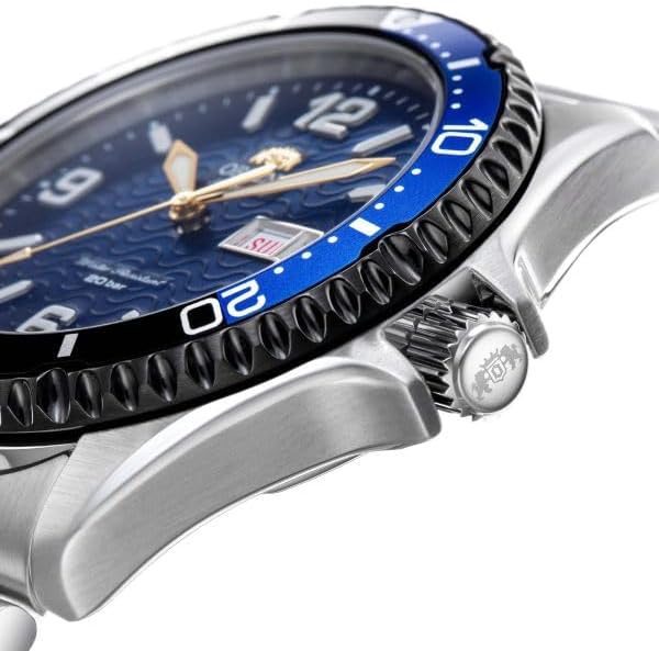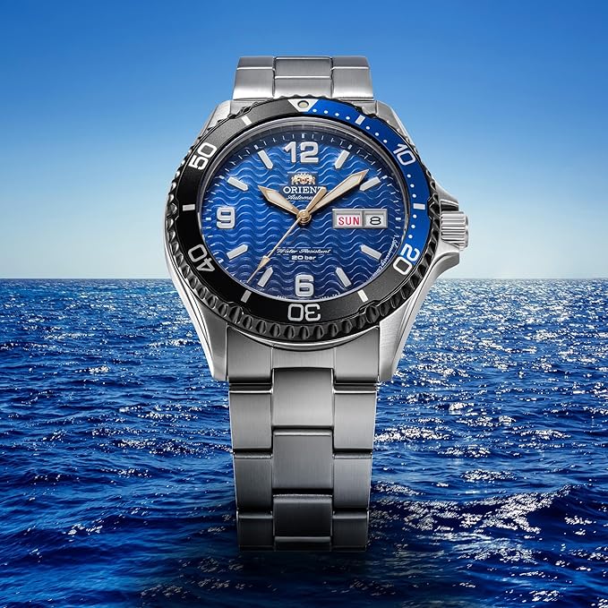 صفحه آبی گرادیانی این ساعت با الگوی موج دریا طراحی شده که نمادی از اقیانوسهای زیبای ژاپن است. عقربهها و اندیسها با قاب طلایی و پوشش شبنما ساخته شدهاند تا خوانایی کامل در شب فراهم شود. لوگوی شیر طلایی برند Orient در زیر اندیس 12 حک شده و عبارت “Anniversary Edition” به زیبایی روی صفحه دیده میشود.