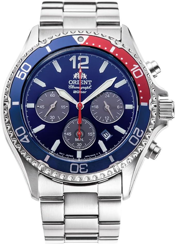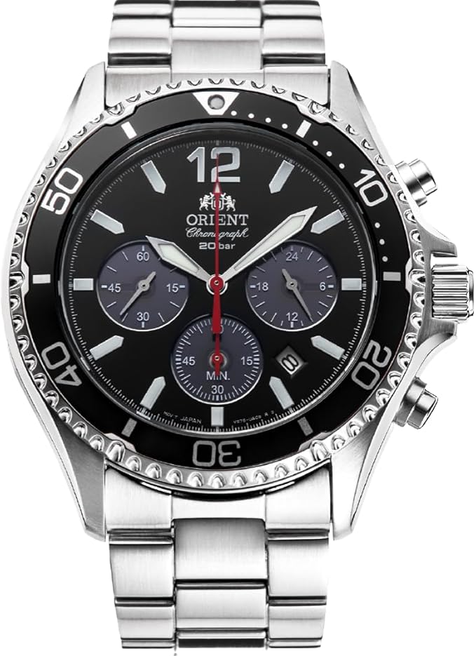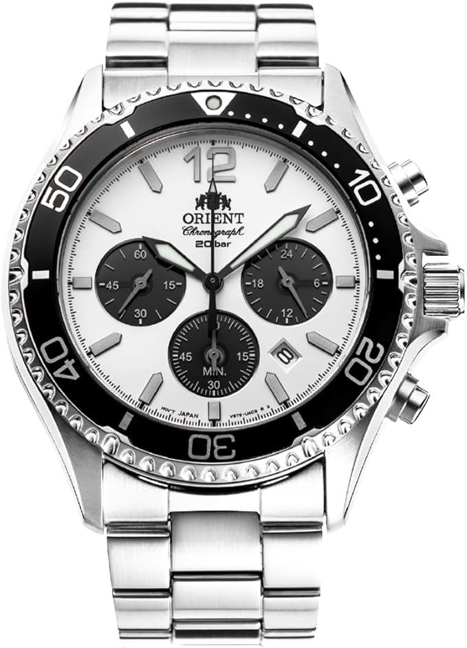 مدل ORIENT Mako Solar Chronograph با شیشه Sapphire، مقاومت 200 متر و موتور اختصاصی ژاپنی، یکی از بهترین گزینهها در این رده محسوب میشود.